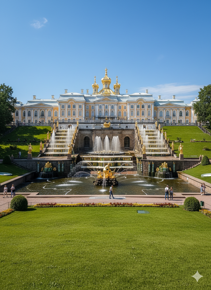 Каскад состоит из десятков фонтанов, золочёных скульптур и двух гротов, скрытых прямо под ступенями. Центральная струя «Самсона» взлетает на высоту около 20 метров — зрелище оглушительное и торжественное одновременно. Каждое утро в 11:00 фонтаны торжественно запускают под звуки «Гимна великому городу» — это стоит увидеть.
