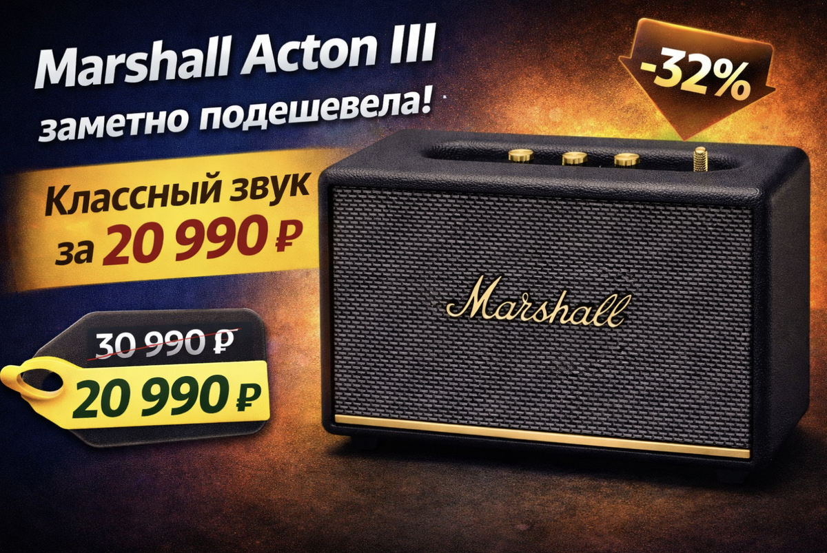 У компактной акустики есть типичная проблема. Она выглядит красиво, но звучит «как фон». Актон III из части Маршалла как раз про другое: небольшая коробка, которая реально выполняет комнату. Сейчас цена 20 990 ₽ вместо 30 990 ₽ . Экономия 10 000 ₽ это примерно −32% . Acton III — это домашняя Bluetooth-колонка , она рассчитана на работу от сети, а не на прогулках и от батареи. Зато дома она настраивала любого «портатива»: поставила на полку и забыла. Заявленная мощность до 60 Вт . Внутри — 1 вуфер 30 Вт и два твитера по 15 Вт , то есть звук не сваливается в «гудение», а держится и низ, и верх. Диапазон расширения частоты 45 Гц – 20 кГц . Для компактного корпуса это хороший ориентир, чтобы бас был ощутимым, а вокал и детали не терялись. Есть Bluetooth 5.2 и вход 3,5 мм . На верхней панели — физические крутилки и кнопки, чтобы быстро и высоко поправить бас и не лезть в меню. На Яндекс Маркете смотрите информацию о продавцах, документацию/версию, условия возврата и комплектации. На скидка