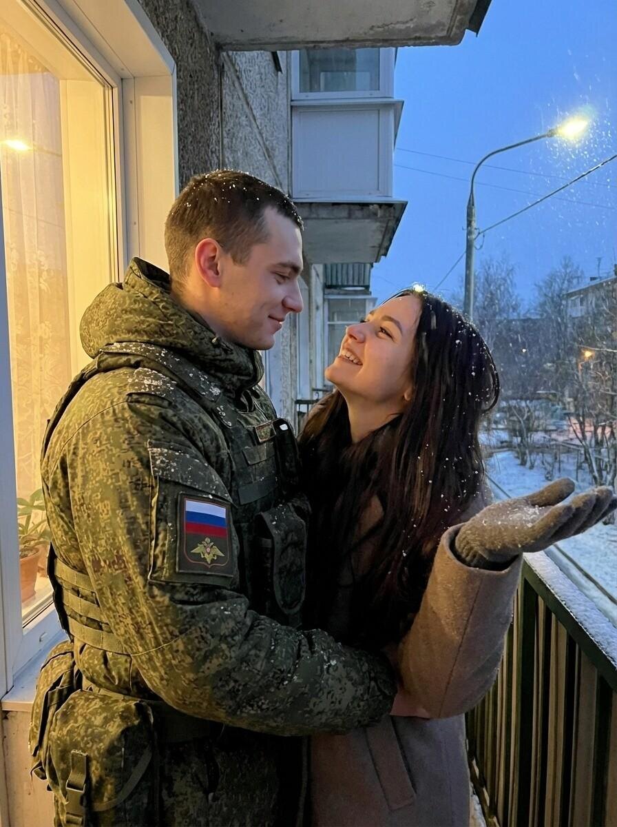 Модель: Nano Banana Сгенерировать🪄 Используй лица мужчины и женщины с загруженных фото. Крупный план, вертикальный формат. Использовать лица мужчины и женщины с загруженных фото — строгое соответствие референсам без изменений. Действие происходит на балконе. Военный в современной российской полевой форме «пиксель» защитного зелёного оттенка. На рукаве чётко видна нашивка с флагом РФ. Форма стилизована под действующую экипировку участников СВО: тактические штаны с карманами, ремень, чёрные берцы. Рядом с ним девушка — она подошла как посетительница к части, и они выбежали на балкон. Она стоит впереди, тянет ладонь вверх, ловя снежинки. Её лицо восторженное, лёгкая улыбка, взгляд направлен на падающий снег. Длинные волосы рассыпаны по плечам, на них тают снежинки. Он стоит сзади, обнимая её, прижимая к себе. Его взгляд направлен не на снег, а на неё — на её лицо, восторг, эмоции. Освещение смешанное: тёплый свет из окна квартиры и холодный свет уличного фонаря создают мягкий контраст,