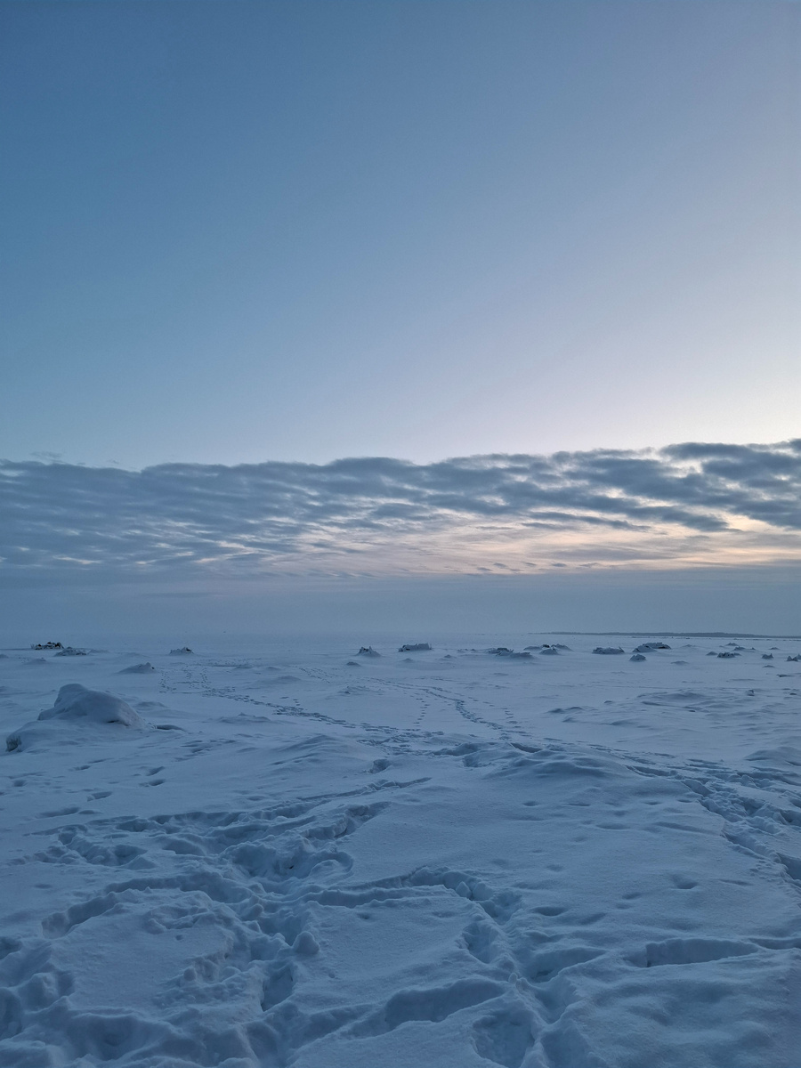 В берегу на снегу были видны немногочисленные следы. Далее на льду снега было совсем немного. Тропа в глубь залива небольшая была и мы пошли по ней. Из-за малого колличества снега на льду, довольно быстро дошли до старой точки в четырёх километрах от берега.
