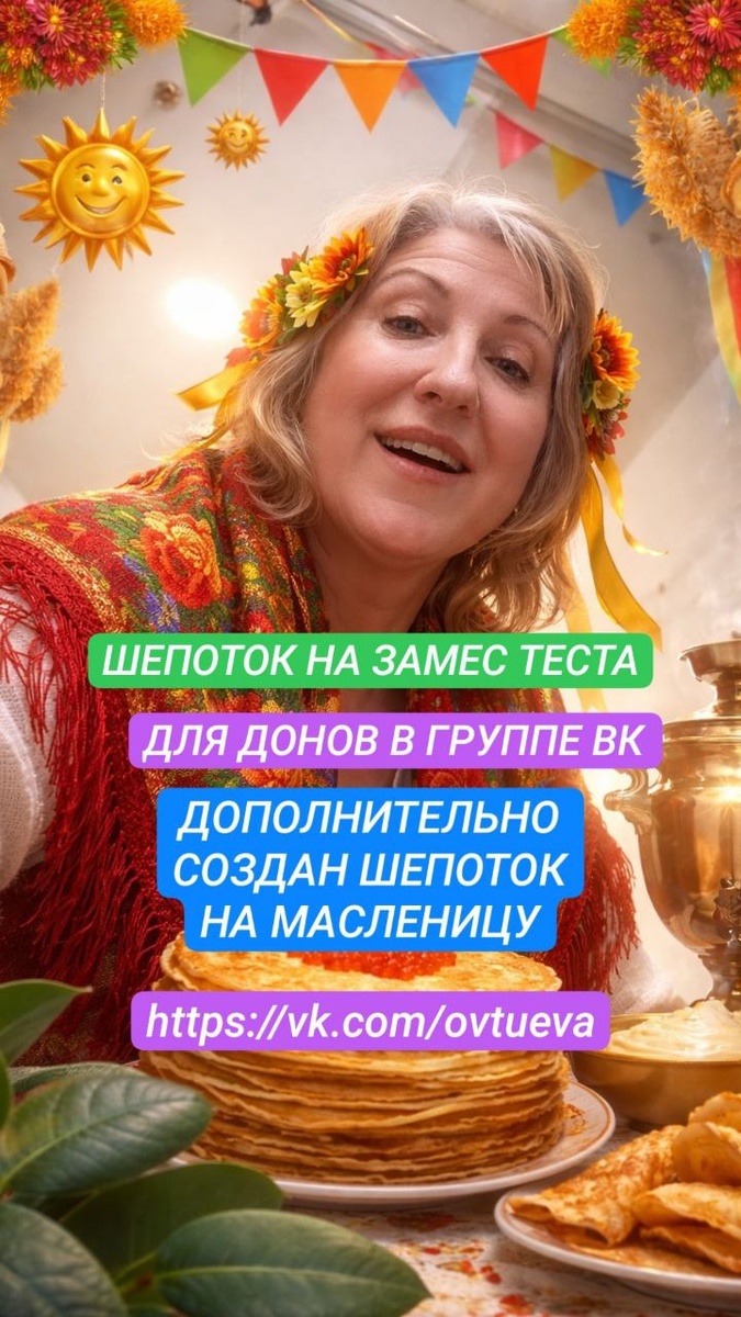 https://vk.com/ovtueva Для Вас к Масленице (22 февраля) дополнительно подготовлена особая шепотковская практика на замес теста для блинов — древняя, тёплая и очень домашняя по своей силе. Это не просто слова и не просто Масленица. Это момент, когда через руки, тесто, огонь и образ солнца вы входите в тонкую сонастройку с пространством достатка, уюта и защиты дома. Блины здесь — не еда, а круги силы, через которые запускается тепло, благополучие и тихая поддержка судьбы. ✨ В закрытом посте я подробно рассказываю, почему первый блин отдают природе, как пространство «слышит» тепло рук, и почему даже визуализация блинов способна запустить процесс, если вы чувствуете и понимаете суть обряда. 🕯 Эта практика подойдёт тем, кто хочет мягко наполнить дом теплом, укрепить ощущение опоры, привлечь достаток без борьбы, и прожить Масленицу не внешне, а по-настоящему глубоко. Особая сила практики в том, что она живая: вы можете делать её руками — или образом, в тишине — или в круге единомышленни