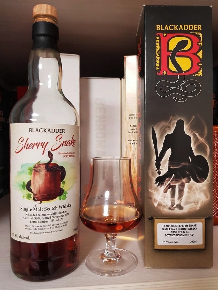 пару-тройку ароматов поймаешь. Зато попозже он хорошо отблагодарит за "усидчивость и терпение". Sherry Snake - один из трёх релизов бочковой крепости без указания возраста, наряду с Red Snake и Black Snake, от независимого шотландского ботлера Blackadder. Часть партий эксклюзивно поставляется для российской алко-сети. Интересно, что этот ноябрьский розлив из бочки SS04 (61,9%)