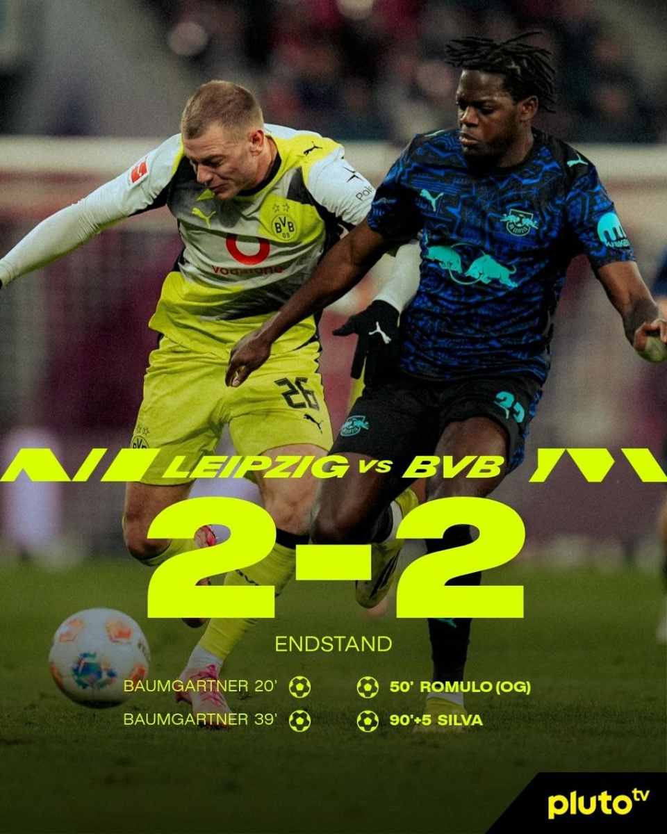 ». Первый тайм был полностью за хозяевами, царил Баумгартнер - австриец сделал дубль. Дортмунд включился во втором тайме. Силва забил первый гол в Бундеслиге. Более того, Брандт мог принести победу, но выручил Вандевоордт. Логичная боевая ничья. Но очень жаль Оле Вернера: снова его «Лейпциг» не сумел удержать преимущество. «Бавария» перед Der Klassiker оторвалась от «Боруссии» на 8 очков. 🇩🇪#Bundesliga #RBLeipzig #BorussiaDortmund
