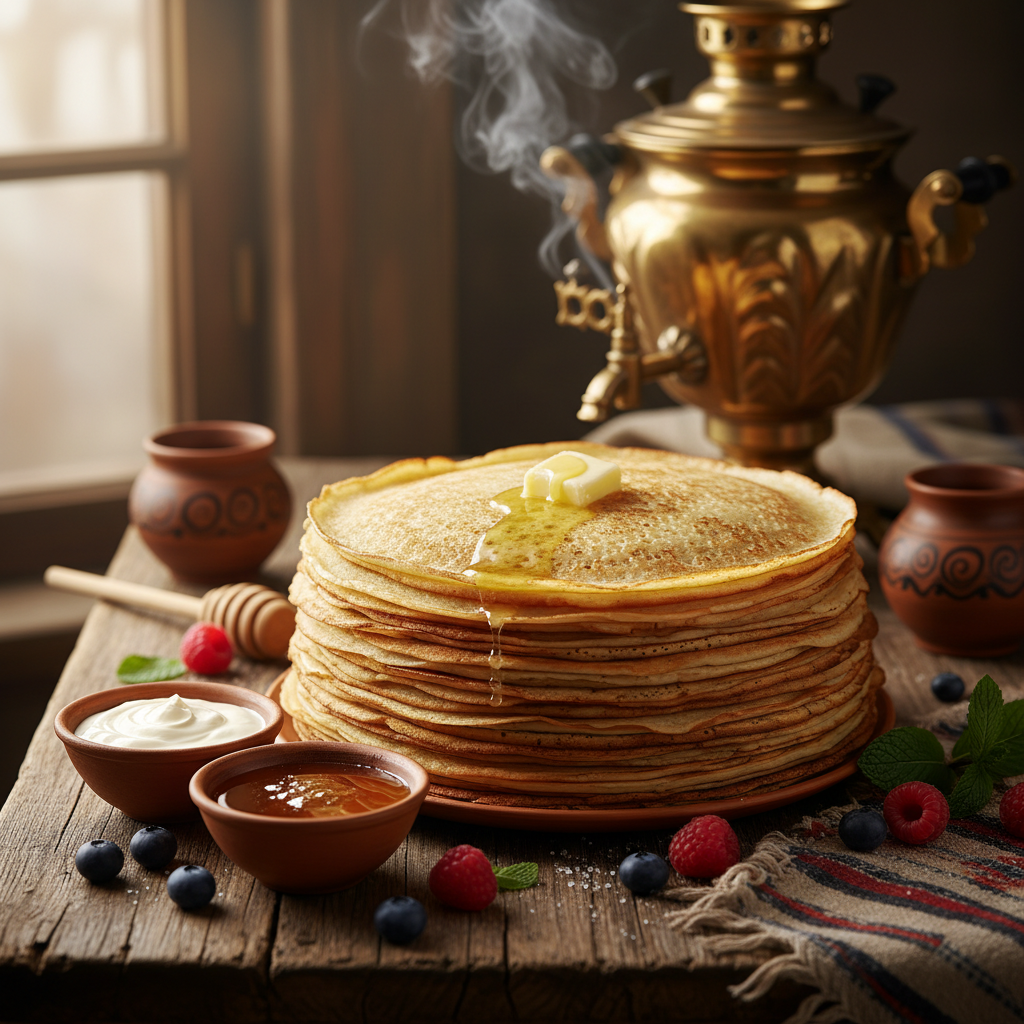 - Классические блины: на пшеничной муке, на дрожжах, на кефире, на молоке; тонкие «налистники» и толстые «драники»-оладьи (регионально).