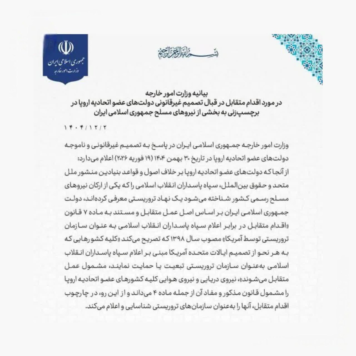 Министерство иностранных дел Исламской Республики Иран в официальном уведомлении объявило военно-морские и военно-воздушные силы всех государств членов Европейского союза террористическими в качестве ответной меры. Это решение принято в ответ на «незаконные и необоснованные» действия европейских правительств по внесению Корпус стражей исламской революции в террористические списки. Тегеран, ссылаясь на закон о взаимных мерах, распространил его действие на вооружённые силы всех стран, которые последуют решениям Соединённые Штаты Америки против КСИР, признав и объявив их террористическими организациями. https://dzen.ru/id/6425916a1950720421f18802