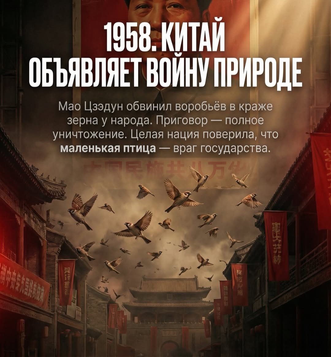 В 1958 г. Коммунистическая партия Китая в рамках политики «Большого скачка» к достижению индустриальных и сельскохозяйственных показателей развитых стран начала кампанию по борьбе против «четырёх вредителей»: комаров, мух, воробьёв и крыс. Если насекомые и крысы подлежали уничтожению по санитарным причинам, то воробьи были виновны в уничтожении посевов. Многие зоологи Китая, инициировавшие за пару лет до этого дискуссию о вреде воробьёв, поддерживали идею борьбы с птицами.