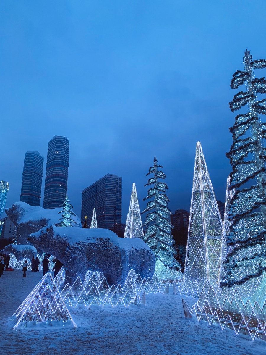 Вот и закончилась зима, и мы прощаемся с полярными медведями - известной и любимой инсталляцией, которую уже несколько лет устанавливают на зиму в районе Ростокино. Я много раз видела её на фото, и очень хотелось вживую посмотреть на этих светящихся гигантов - уж очень милая и необычная композиция получилась. Неудивительно, что жители Ростокино так ее полюбили. Впервые мишек установили в парке Акведук к новогодним праздникам 2018-2019 годов. Потом ее, правда, в качестве эксперимента на одну зиму переносили в парк Горького, но по просьбам жителей в следующем сезоне вернули обратно. Думаю, это правильное решение, и теперь мишки - это уже символ района Ростокино и парка. Пришли мы в парк, когда наступали сумерки, и полярные медведи только начинали потихоньку светиться, а пока гуляли, фигуры становились все ярче и ярче. Так что лучше всего любоваться Умкой и его семьей в вечернее время. Умка и его мама-медведица - главные герои композиции. Они и являются самыми большими фигурами, теми, ч