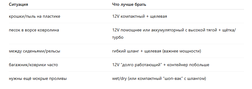 - Нужно “просто крошки” → компактный 12V от прикуривателя, условно 60–100 Вт (главное — длинный шнур и щелевая насадка).