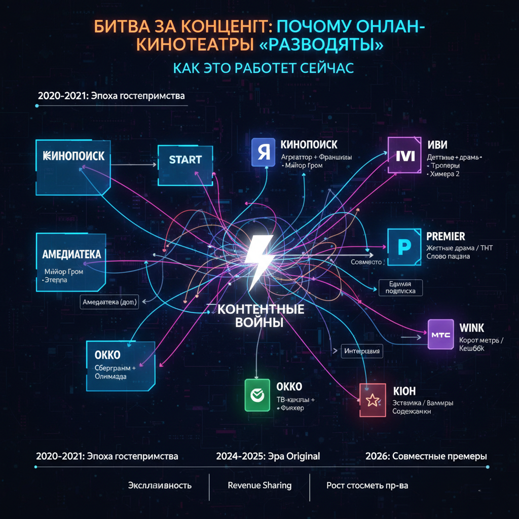 - 2024–2025 годы — Эра Original-проектов. Теперь каждый сервис (Premier, Иви, Okko, Wink) вкладывает миллиарды в собственные эксклюзивные сериалы («Слово пацана», «Чистые», «Монастырь»). Делиться ими с конкурентами «просто так» стало невыгодно.