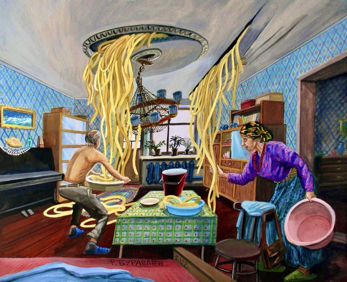 Представьте себе: вечер, уют, тишина… Ну, почти тишина. Потому что где-то там, за тонкой стеной, раздается нечто, что можно описать только как "телевизионный потоп". И вот, художник Фёдор Буравлёв, словно гениальный диагност нашей эпохи, ловит этот момент и превращает его в картину под названием "У соседей телевизор прорвало". И поверьте, это не просто бытовая зарисовка, это настоящий взрыв остросоциального юмора, который заставляет нас задуматься: а что же на самом деле льется из наших экранов? Первое, что бросается в глаза на картине Буравлёва – это, конечно, сам "прорыв". Это не просто вода, это целый поток информации, который буквально вырывается из телевизора соседей. И этот поток несет с собой нечто большее, чем просто влагу. Это могут быть обрывки новостей, кричащие заголовки, мелькающие лица политиков, сцены из бесконечных сериалов, реклама, которая обещает нам счастье за три клика… Все это смешивается в бурлящую массу, которая грозит затопить не только квартиру соседей, но и н