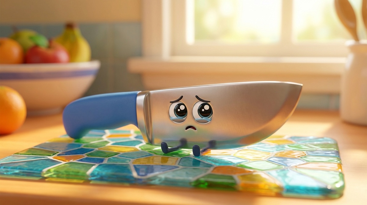 Стекло — это невероятно твердый материал. Когда металлическое лезвие ножа с силой ударяется о стеклянную поверхность, его режущая кромка моментально деформируется и затупляется.