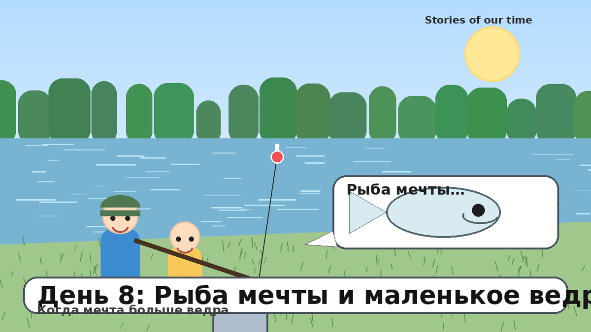 Лиза пришла на рыбалку с ведёрком размером “на две ягодки”. — Это зачем? — спрашиваю. — Для рыбы мечты, — отвечает она уверенно. — Если она большая, я просто буду держать ведро крепче. Мы сели у воды. Поплавок стоял смирно, как ученик на контрольной. Лиза смотрела на него так, будто гипнотизировала. Минут через двадцать поплавок дрогнул. Потом — ещё. Потом ушёл под воду так уверенно, будто сказал: “Ну всё, поехали”. — Есть! — Лиза подсекает и вдруг замирает. — Пап… она тяжёлая! Удочка гнётся, Лиза пыхтит, я подстраховываю. В этот момент дед (он всегда появляется в самый драматичный момент) говорит: — Главное — не торопись. Рыба любит спокойных людей. Лиза шепчет, не отрываясь от лески: — Рыба мечты… пожалуйста… помещайся… И вот на поверхности блеснул бок. Потом показалась рыбина… приличная! Лиза уже тянет своё микроведро к воде. Я осторожно вытаскиваю улов — это оказался хороший карась. Лиза радостно “примеряет” ведро… и карась в него не помещается вообще никак. Лиза секунду думает, по