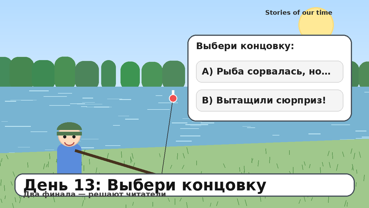 Поклёвка была такая, что я сразу понял: это оно. Та самая рыба, про которую потом рассказывают всем, даже людям, которые не просили. Удочка согнулась, леска натянулась, я начал тянуть осторожно. Сын шепчет: — Пап, только не торопись. Помнишь, как шапка утонула? Я вспомнил и замедлился. Рыба тянула уверенно, без суеты — как будто знала правила. Я подвёл добычу к берегу… и тут произошло что-то резкое. Дальше — вы выбираете концовку: A) Рыба сорвалась в последний момент, но мы нашли на берегу кое-что неожиданно важное. B) Мы вытащили “сюрприз”, который не был рыбой, но стал историей месяца. Пиши в комментариях A или B, а завтра я закреплю самый популярный вариант и продолжу историю по нему 😄 Ключевые слова: рыбалка, интерактив, выбери концовку, поклёвка, трофей, истории, поплавок, улов.