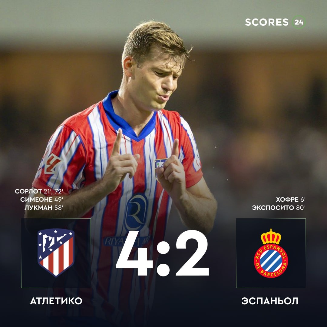 » 🇪🇸 Команды очень порадовали яркой игрой, забив шесть мячей на двоих 🤩 Отметим и очередной перфоманс от Адемолы Лукмана, у которого 4+2 за шесть игр в стане «матрасников» 👍