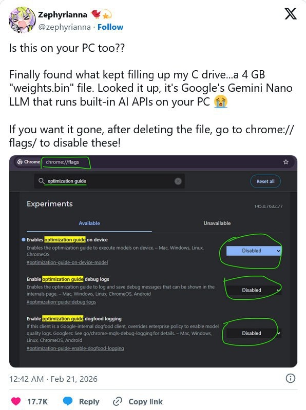 Оказывается, Google скрыто качает на ваш комп файл weights.bin — этот балласт весом в 4 ГБ появляется автоматически, даже если вы никогда не просили. Вот как его можно вырезать С КОРНЕМ: 🔴 Вбиваем в поисковой строке браузера — chrome://flags/ 🔴 Находим через поиск и ставим Disabled для Optimization Guide On Device Model и Prompt API 🔴 Идём по пути AppData/Local/Google/Chrome/User Data/OptGuideOnDeviceModel/ и удаляем ВСЁ содержимое Готово — теперь у вас есть свободное место для любимого фильма и других файлов. Сохраняем. CtrlAltDelights- подписаться