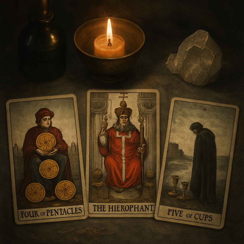 Эта карта раскрывает очень важный аспект его поведения с соперницей. Четвёрка Пентаклей говорит о человеке, который судорожно цепляется за своё, словно боится потерять контроль над ситуацией. В контексте отношений с этой женщиной он ведёт себя крайне расчётливо и замкнуто. Он не открывается ей полностью, держит дистанцию на эмоциональном уровне. Представьте человека, который обнимает сундук с сокровищами и не желает никого к нему подпускать. Именно так он относится к своим чувствам, своему личному пространству, возможно даже к финансам в этих отношениях. Он не готов вкладываться в неё по-настоящему. Это отношения, где присутствует жадность не обязательно материальная, но точно эмоциональная. Он экономит себя, свою энергию, своё время. Возможно, он даже боится, что соперница захочет от него слишком многого, и поэтому заранее выстраивает границы и барьеры. Это холодная, расчётливая позиция человека, который думает прежде всего о собственной безопасности и выгоде.