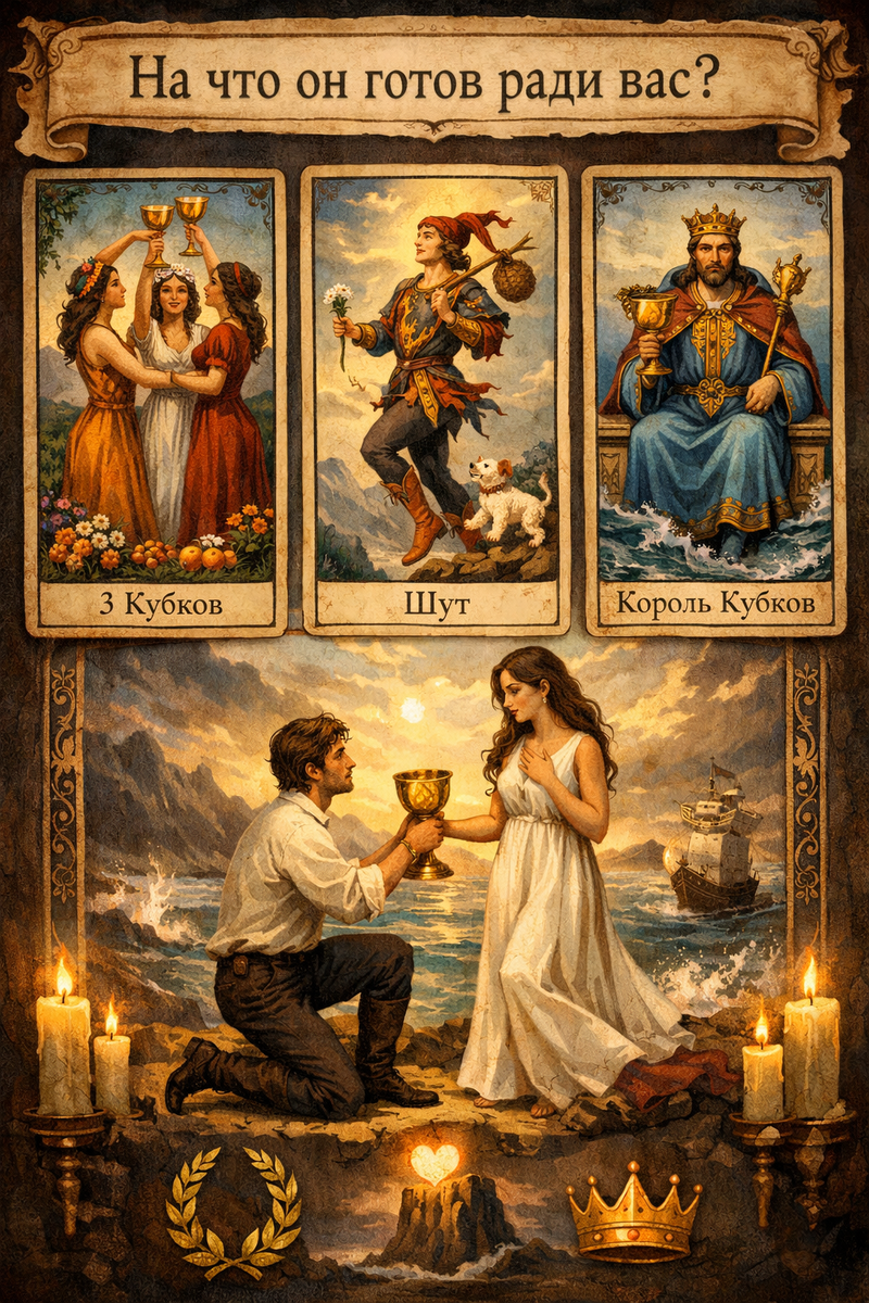 Комбинация карт 3 Кубков, Шут и Король Кубков показывает, что он готов ради вас на многое, и его готовность охватывает как лёгкие, радостные аспекты, так и глубокие эмоциональные обязательства.