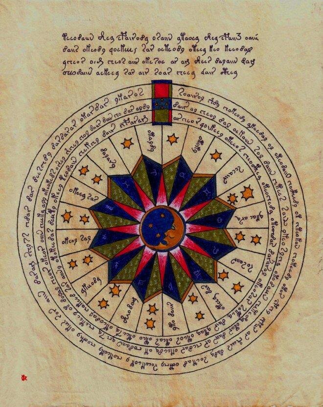 Второй блок — астрономический. Здесь мы видим диаграммы с солнцем, луной, звёздами и странными символами. Некоторые диаграммы напоминают астрологические карты, другие — схемы движения небесных тел. Есть даже рисунки, которые интерпретируют как галактики или туманности, что для пятнадцатого века выглядит немыслимо.