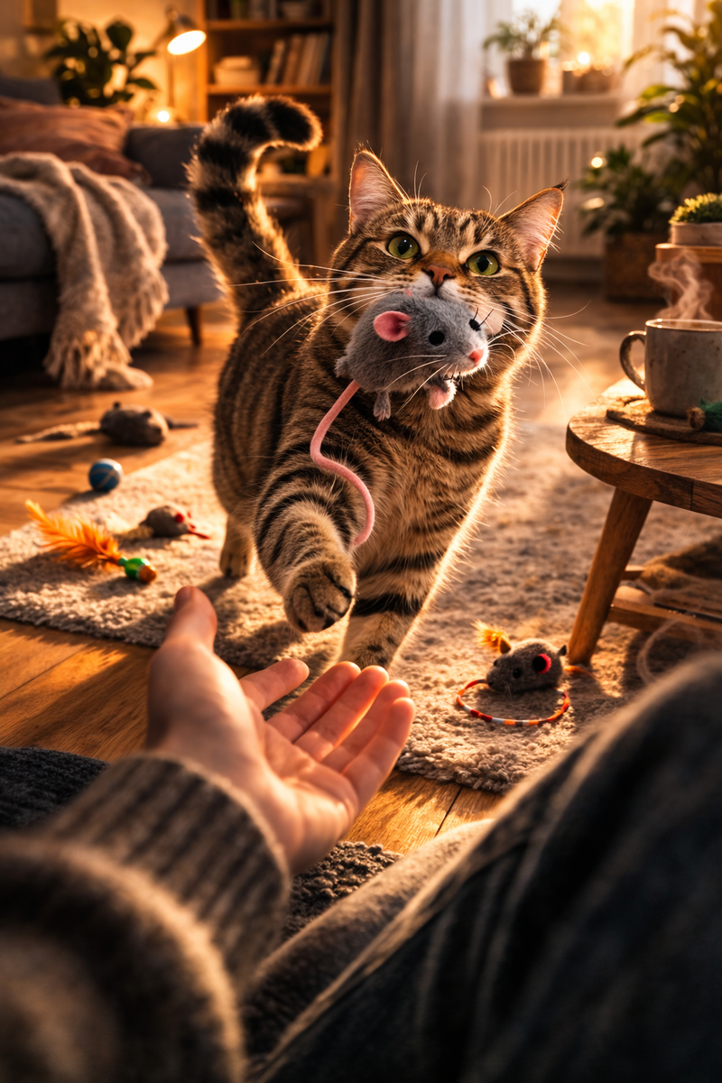 В зубах — игрушечная мышь. Или носок. Или что-то совершенно неожиданное.