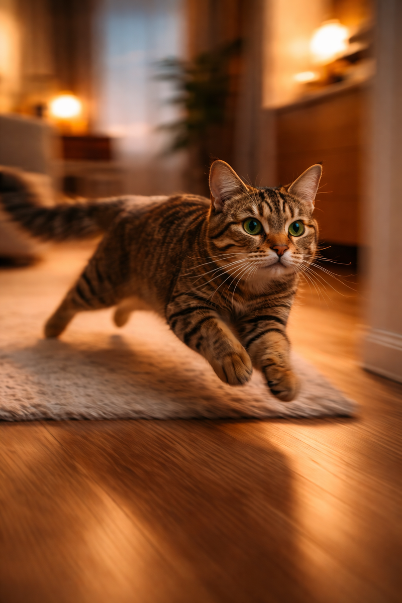 Он срывается с места, мчится по коридору, резко меняет траекторию, взлетает на диван, отталкивается от стены, исчезает в другой комнате и возвращается обратно, словно участвует в соревновании, о котором вы ничего не знаете.