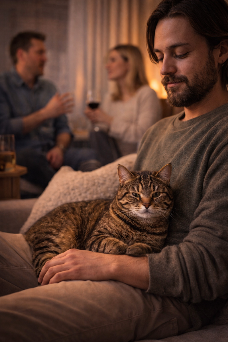 И если кот выбрал именно вас в шумной комнате — возможно, вы просто самый спокойный центр в этом пространстве.