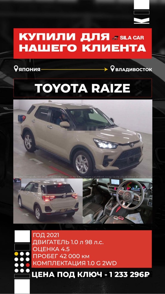 🔥 Никаких скрытых комиссий ❗️️Работаем строго по договору ┏ Реально честная комиссия: ┣ 50 000₽ на авто до 1 млн ₽ ┣ От 1 до 2,5 млн. ₽ - 70.000₽ ┗ От 2,5 млн. ₽ - 100.000₽ САМЫЕ ЧЕСТНЫЕ ЦЕНЫ НА РЫНКЕ ⬇️ Объём двигателя, см3 1000 Цена "на кнопке" ¥1 420 000 р.739 394,00 Комиссия за дорогую покупку ¥15 000 р.7 810,50 Расходы по Японии ¥70 000 р.36 449,00 Фрахт ¥55 000 р.28 638,50 Итого стоимость по инвойсу ¥1 560 000 812 292,00 ₽ Ставка таможенного платежа р.270 804,90 Тип силовой установки Топливо или параллельный гибрид Суммарная мощность, кВт 0,00 0 л.с. Утилизационный сбор* р.5 200,00 Брокерские услуги, СВХ, погрузо-разгрузочные работы, прохождение лаборатории р.65 000,00 Приёмка и забор автомобиля с СВХ, доставка до лаборатории, доставка до стоянки р.10 000,00 Честная комиссия СИЛА КАР р.70 000,00 Итого во Владивостоке: 1 233 296,90 ₽ 🔴Купил менеджер Даниил 📞 +7(908)979-36-95 🔵@SilaCarDAN 👉Для РАСЧЕТА СТОИМОСТИ АВТО жмите сюда💪 💻Самостоятел