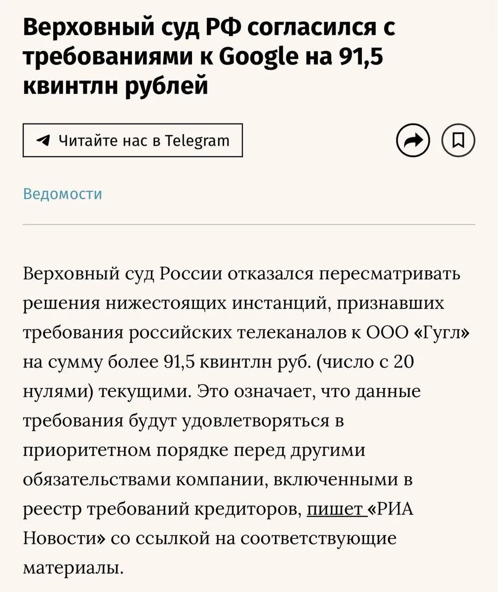 Верховный суд РФ согласился с требованиями к Google на 91,5 квинтиллиона рублей (число с 20 нулями, это больше, чем все деньги в обращении в мире) Верховный суд отказался пересматривать решения нижестоящих инстанций. В 2020 году «Царьград» и РИА ФАН подали к американской Google LLC, ирландской Google Ireland, а также к российскому ООО «Гугл» иски с требованием восстановить заблокированные на YouTube аккаунты каналов. Спустя год суд поддержал их требования. Компания Google не восстановила доступ к каналам, а потому по истечении срока девять месяцев за каждый день неисполнения ей начал начисляться штраф 100 тыс. руб. В качестве третьих лиц пострадавшими по делу проходят телеканалы «Звезда», «Первый канал», ВГТРК и еще ряд телеканалов. После начала военной операции Google приостановила деятельность в России. В октябре 2023 года компания была признана банкротом. После этого суд ограничил начисление судебной неустойки, так как счел, что после банкротства организация не имела возможности исп