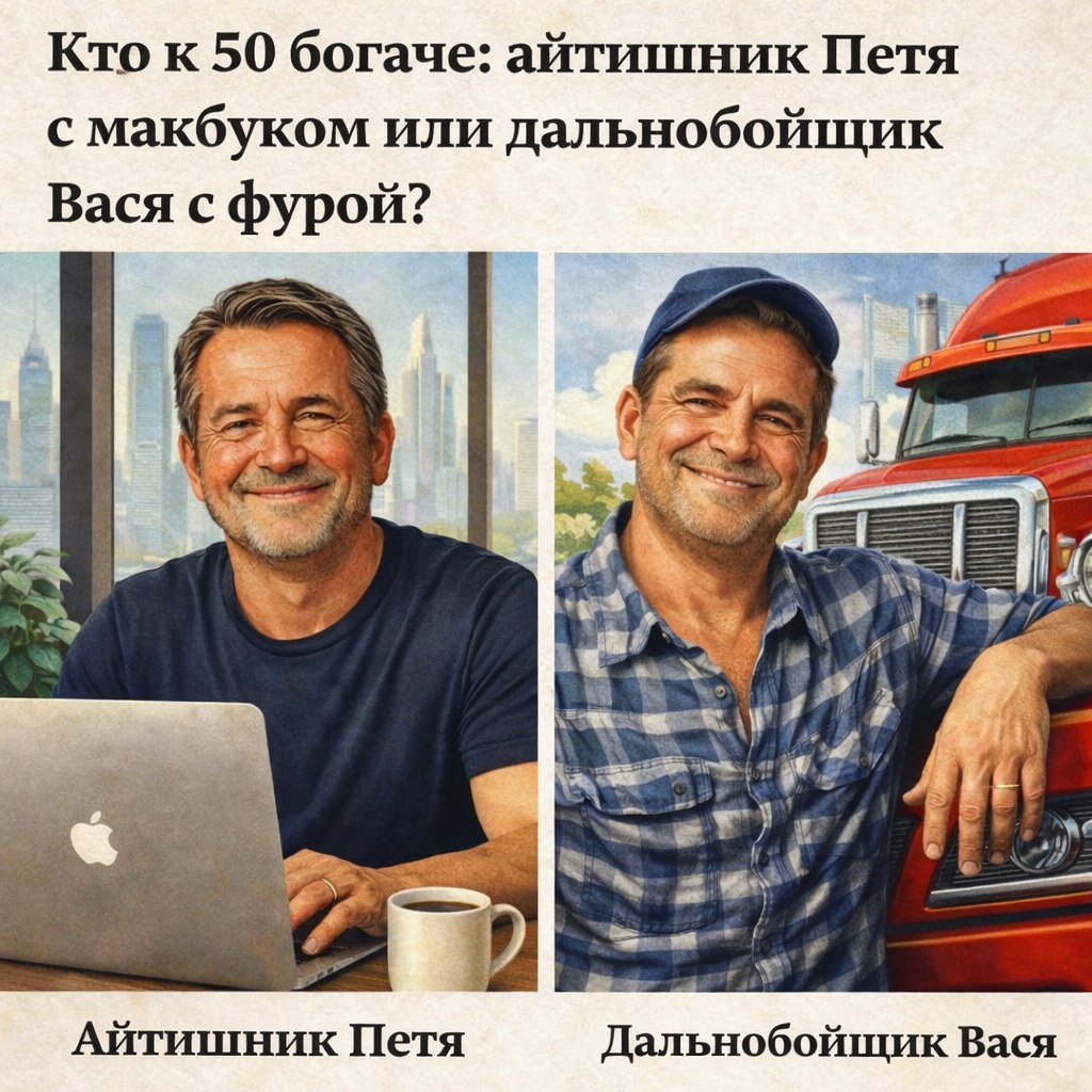 Петя у нас будет айтишником. Вася — дальнобойщиком. Обоим стукнуло 50. Кто при деньгах? А главное — кто счастлив?