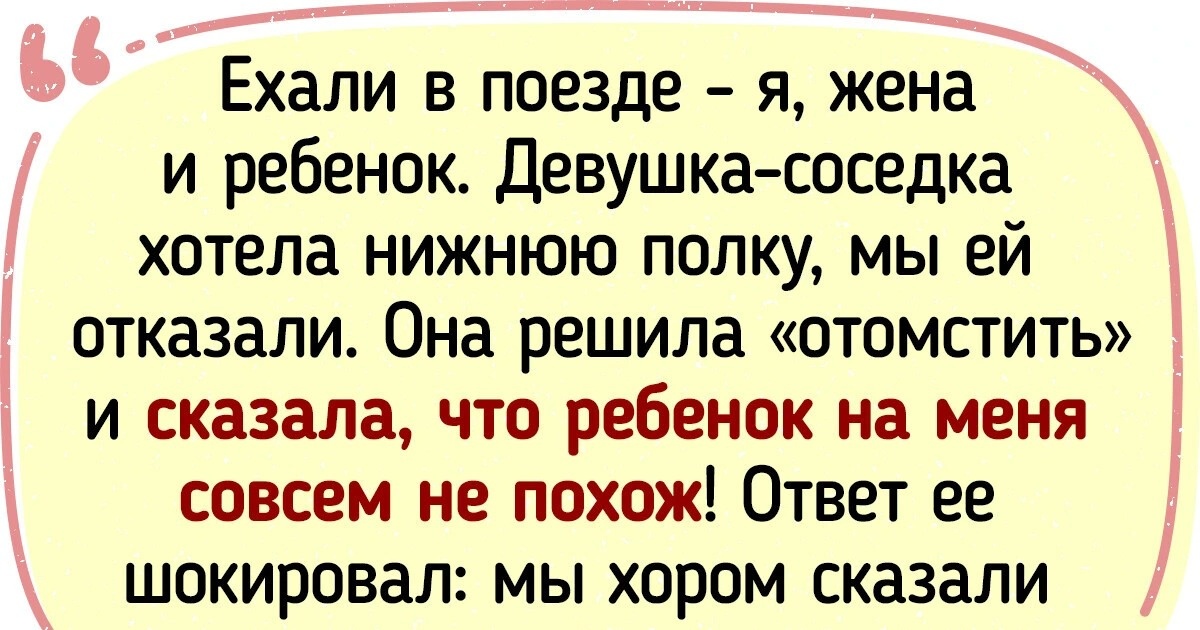 Ехали в поезде втроем — я, жена и ребенок. Девушка хотела нижнюю полку, мы ей отказали. Так она решила «отомстить» и сказала, что ребенок на меня совсем не похож! Ответ ее шокировал: мы втроем хором сказали, что знаем! © legal.eyes / Pikabu Моему мужу после смерти мамы осталась в наследство однокомнатная квартира, и мы сдаем ее арендаторам. И вдруг объявляется какой-то дальний родственник — двоюродный дядя, которого муж в жизни ни разу не видел. И заявляет: мол, его сын собирается поступать в институт, они не хотят, чтобы он жил в общежитии, а у них самих дома тесновато (причем живут они в том же городе, что и мы). Спрашивает, можно ли парню пожить в нашей квартире на время учебы. До сентября еще есть время, так что, по его словам, мы можем предупредить жильцов, чтобы те съехали. Муж аж поперхнулся от такого предложения. И отвечает: хорошо, стоимость аренды такая-то, плюс оплата коммунальных услуг. А родственник в ответ: мы вообще-то рассчитывали пожить по-родственному, без денег. Квар
