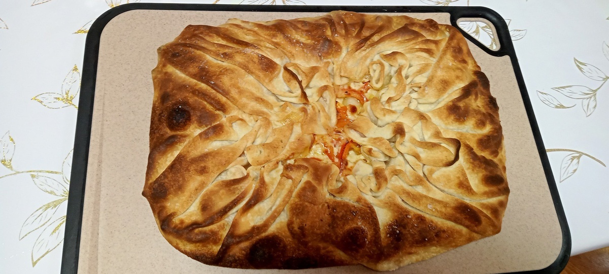 ✨ Простая деревенская галета с тончайшим тестом, хрустящими складками и сочной начинкой — идеальный вариант уютной домашней выпечки без сложного формования. 🧺 Тесто: • 1 ст. муки первого сорта • 1 ч. л. соли • 1 ст. л. топлёного масла • 0,5 ст. тёплой воды или кефира (в рецепте — кефир) 🫑 Начинка: • 1 красный болгарский перец (300–400 г), нарезанный брусками • 150–200 г сыра «Натура», тонкими пластинками • 0,4 ч. л. соли • щепотка асафетиды • щепотка молотого чёрного перца • 1 ст. л. топлёного масла 👩🍳 Приготовление: 1️⃣ Тесто Смешайте сухие ингредиенты. Добавьте топлёное масло и кефир. Замесите однородное тесто, хорошо вымесите — чем дольше, тем пластичнее оно станет. Заверните в плёнку и оставьте отдыхать на 20 минут. 2️⃣ Формирование Раскатайте тесто очень тонко (1–2 мм). Аккуратно растяните руками до почти прозрачного состояния. Перенесите пласт на обильно смазанный маслом противень. продолжение завтра