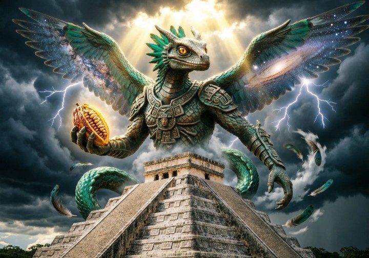 Легенда гласит, что Кетцалькоатль — Пернатый Змей, бог ветра и знания — спустился с небес и подарил людям какао-дерево, похитив его у богов. За это боги изгнали его, но перед уходом Кетцалькоатль пообещал вернуться.