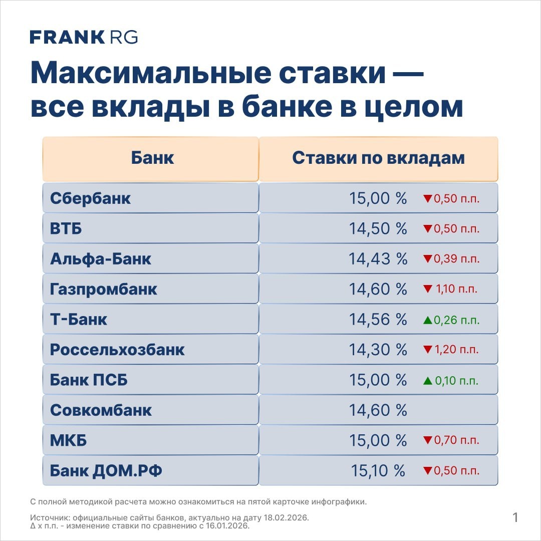 Согласно Frank Research Group, cредняя максимальная ставка по депозитам в топ-10 банков впервые с мая 2024 года стала ниже 15%. Наиболее заметное падение доходности показали вклады на три месяца. Собственно, ничего нового, просто, об этом здесь было написано еще 13 февраля. Но обратите внимание, что наибольшее падение на вкладах 3-меясца, это значит, что банки ждут понижение ключевой ставки меньше чем через месяц, в следующее заседание ЦБ. Поэтому, если видите ставки 15% по банкам, входящим в систему страхования вкладов (а такие почти все), размещайте. Главное помнить про 1,4 млн рублей. Следующее заседание по ключевой ставке - 20 марта 2026 года. @fincredforyou Наш канал появился в Макс. Подписывайтесь, чтобы не потеряться )