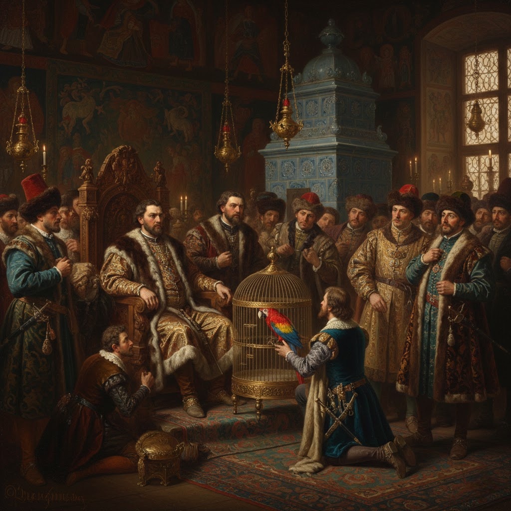 Представьте изумление бояр: перед ними живое существо, которое не только переливается всеми цветами радуги, но и — по слухам — может повторять человеческую речь! В те времена это казалось почти чудом или магией.