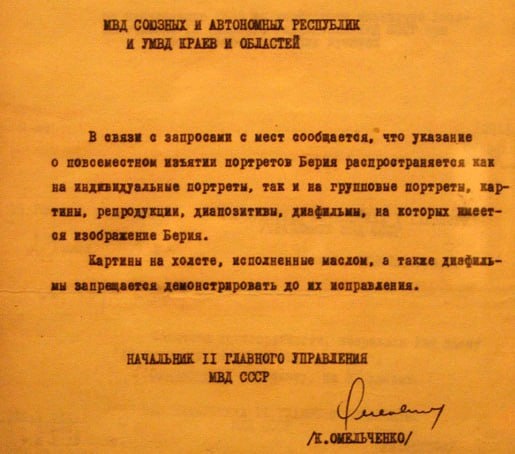 » 22 февраля 1953 года в СССР проходили выборы в местные советы депутатов. И одним из кандидатов в Мурманский совет баллотировался Лаврентий Павлович Берия. Мурманск был выбран для «почетного депутатства» не случайно – регион имел стратегическое значение для курируемого Берией атомного проекта и системы лагерей ГУЛАГа. Тем не менее, карьера Берии как депутата мурманского Горсовета «не сложилась». Уже 26 июня 1953 года на заседании Совмина он был арестован, а в июле на Пленуме ЦК КПСС его объявили «врагом народа» и исключили из партии, что автоматически делало невозможным его дальнейшее пребывание на выборных должностях. На этой волне мурманский совет просто аннулировали полномочия Лаврентии Берии на основании «вскрывшихся антигосударственных действий». В советских газетах того времени это подавалось как «единодушное требование избирателей» отозвать своего депутата. ❄ «Арктический Обозреватель» // Циркуляр начальника 2-го Главного управления МВД СССР К. Омельченко об изъятии портре