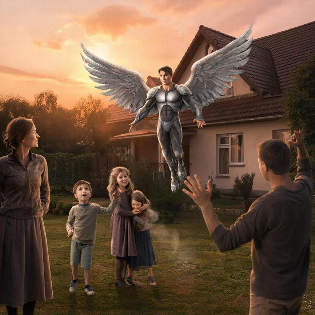 Он расправил крылья, взмыл вверх и через секунду исчез в утреннем небе. Дети долго смотрели ему вслед, а потом побежали к Маме — рассказывать, какой у них замечательный дядя.