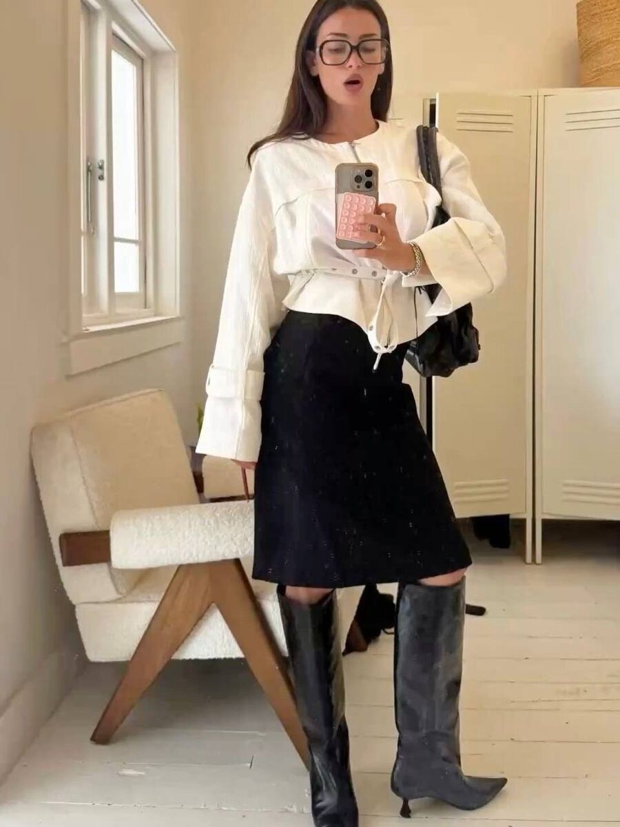 Юбка может быть практически любой: подойдут и плотные, и тонкие. А вот голенище сапог должно заканчиваться чуть ниже колена, но точно не быть короче. В противном случае образ с такой обувью и юбкой сделает вас визуально ниже. Grazia