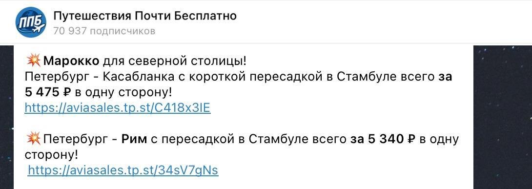 В телеграм-канале «Путешествия Почти Бесплатно» ежедневно публикуют: — туры с вылетом из СПб по минимальным ценам — дешёвые авиабилеты (Азия, Турция и Египет, внутренние рейсы) — выгодные отели и варианты проживания Без «подборов за деньги» и лишней болтовни. Только конкретные даты и реальные цены. Подписчики канала уже экономят десятки тысяч на одном отпуске. Подписывайтесь и проверяйте сами: Путешествия Почти Бесплатно