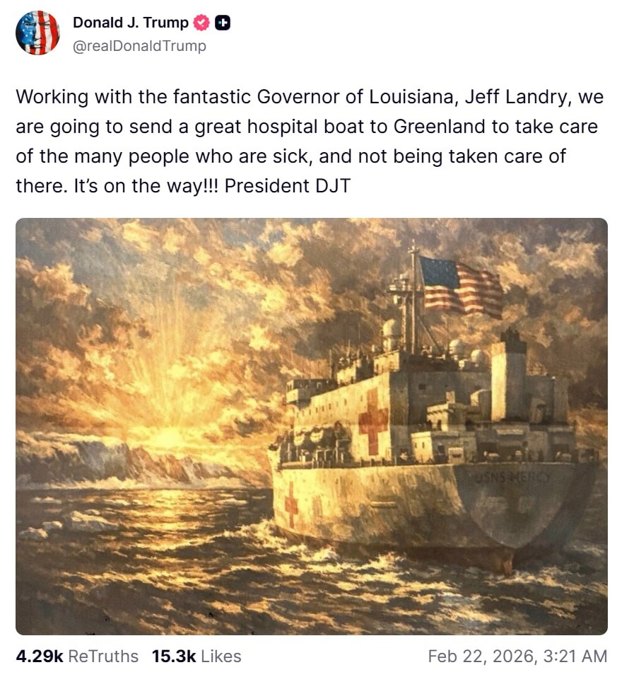 Совместно с замечательным губернатором Луизианы Джеффом Лэндри мы собираемся отправить в Гренландию большой плавучий госпиталь, чтобы