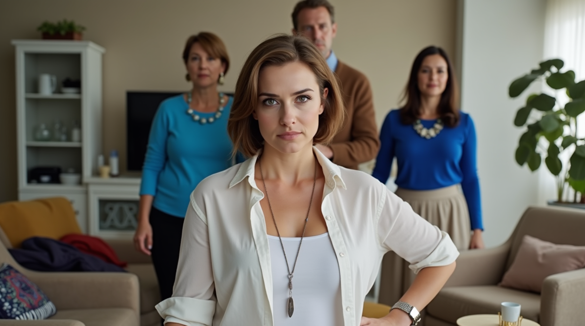 Регина не отступила ни на шаг. Она стояла в дверном проёме, держась за косяк, и смотрела на них всех — на мужа, который стоял чуть в стороне с виноватым видом, на свекровь, которая уже приготовила слёзы, на Светлану, сжимающую пакеты, на Вику, которая прятала глаза.