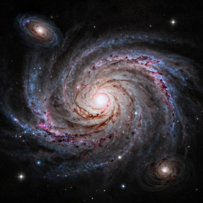 На краю наблюдаемой Вселенной, в эпохи, когда, согласно классическим научным теориям, в космосе только зарождались первые звёзды, астрономы обнаружили нечто неожиданное: 70 массивных, химически удивительно зрелых галактик. Оказалось, что история формирования звёзд и галактик началась раньше, чем считалось — как минимум 13 миллиардов лет назад. Изображение: нейросеть freepikНедавно обнаруженные с помощью телескопов «Джеймс Уэбб» и ALMA объекты — это так называемые пылевые галактики (или dusty-galaxies) со вспышками звёздообразования, то есть огромные скопления звёзд, окружённые плотными облаками пыли и газа. Их удалось наблюдать такими, какими они были менее чем через миллиард лет после Большого взрыва. На этом этапе истории Вселенной, как считалось, были довольно лёгкие, ещё формирующиеся галактики. Однако наблюдаемые объекты массивны, активно производят звёзды и, как ни странно, уже богаты элементами. К ним относятся кислород, железо и кремний, и их наличие означает, что по крайней ме
