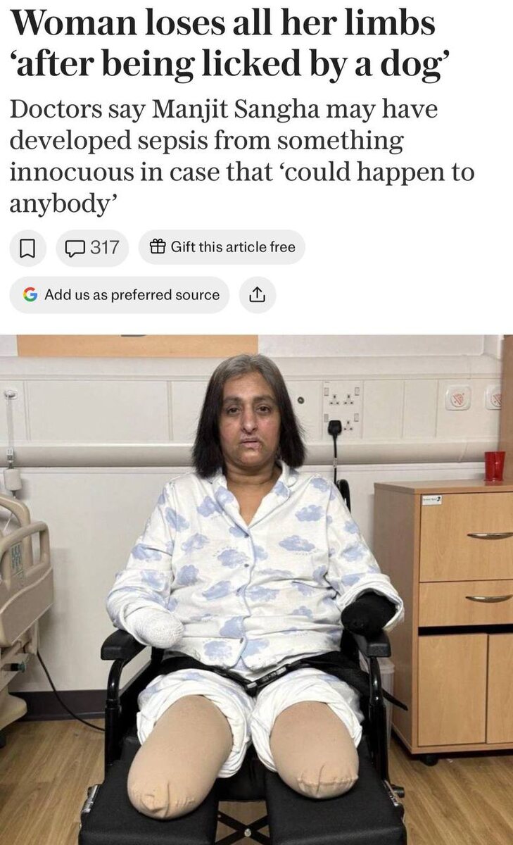 52-летней британке ампутировали руки и ноги после того, как её облизала собака, пишут местные СМИ