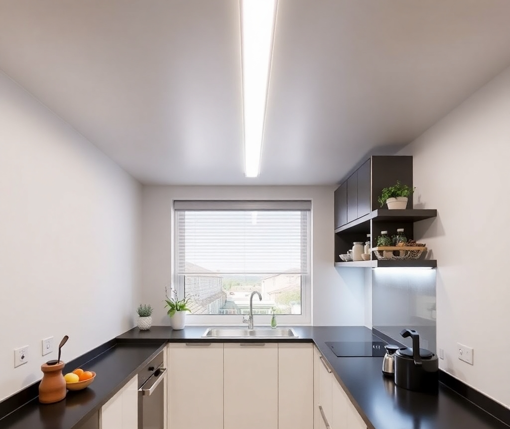 LED-профили и линейный свет создают эффект парящего потолка. Алюминиевый профиль глубиной 3-6 сантиметров скрывает ленту с 120-240 диодами на метр, а матовый рассеиватель делает свечение мягким и равномерным. Световые линии вписываются как продолжение потолка, удлиняя тесную кухню визуально. Плюс в полной скрытости, минус требует идеально ровной ниши. Нюанс - профиль обязательно охлаждает ленту, иначе локальный перегрев пожелтеет полотно.