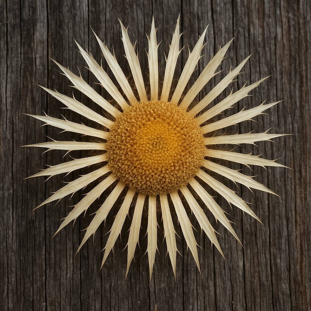 Название этого оберега звучит как заклинание: eguzki (солнце) и lore (цветок). Но это не мистическая фантазия, а реальное чудо природы — Carlina acaulis (Колючник бесстебельный). Этот серебристо-золотистый чертополох растет на солнечных склонах гор северной Испании и юга Франции, впитывая в себя свет каждой гранью своих жестких лепестков.