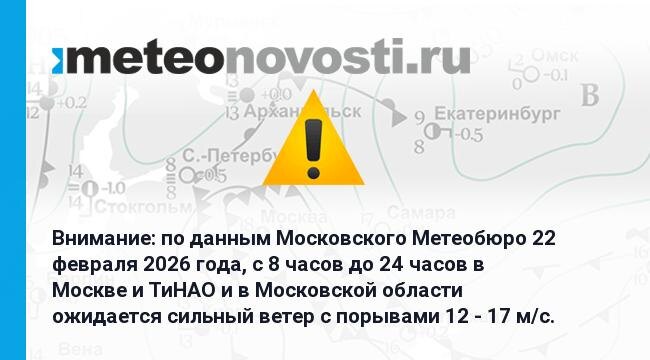 Внимание: по данным Московского Метеобюро 22 февраля 2026 года, с 8 часов до 24 часов в Москве и ТиНАО и в Московской области ожидается сильный ветер с порывами 12 - 17 м/с.