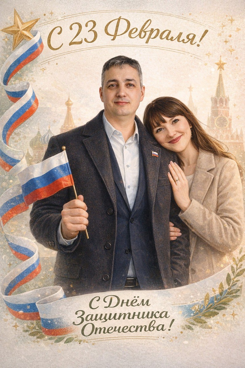 1. Используй загруженные фото пары как точный референс внешности, сохранить лица. Создай вертикальную праздничную открытку к 23 февраля. Композиция: светлый праздничный фон с лёгкой текстурой бумаги. Мужчина стоит уверенно в центре в стилизованном парадном образе защитника (аккуратное классическое пальто, белая рубашка), спокойный серьёзный взгляд. Девушка рядом, нежно держит его под руку или кладёт руку на плечо, тёплая поддерживающая улыбка. Добавь символику РФ: аккуратная лента в цветах российского флага (бело-сине-красная) в композиции, флажок РФ в руке или на фоне, мягкий силуэт Кремля или звезда как декоративный элемент. Без агрессии и оружия, праздничная атмосфера. Стиль — современная иллюстративная открытка с лёгким винтажным настроением, пастельные зелёные, золотистые и триколор-акценты. Вверху надпись: «С 23 Февраля!», внизу — «С Днём Защитника Отечества!». Высокая детализация, чистая композиция.