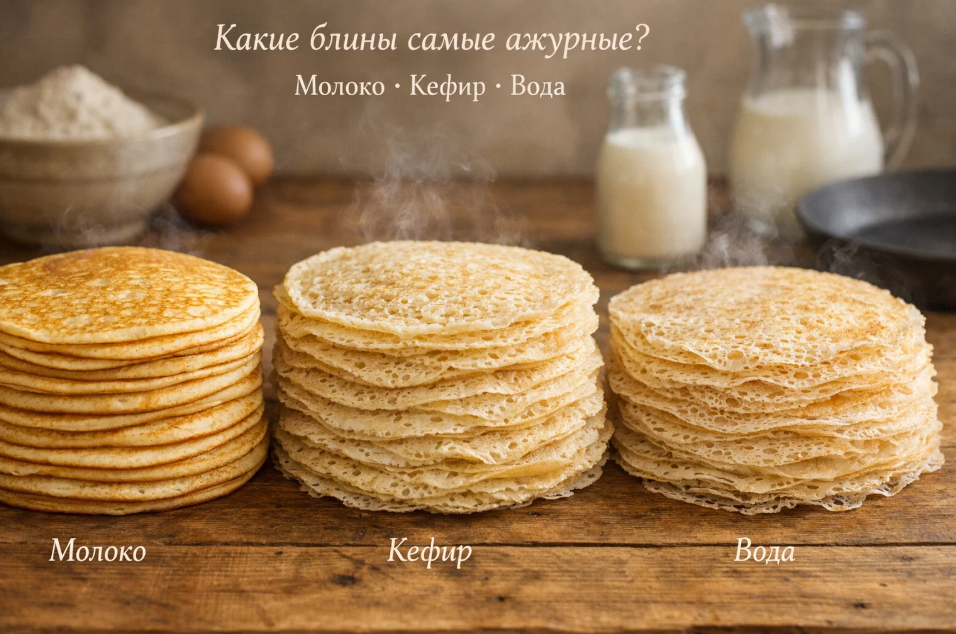 Блины — это одно из тех блюд, которое кажется простым только на первый взгляд. Казалось бы, что может быть сложного в замешивании теста и выпекании тонких лепешек на сковороде? Но стоит только начать экспериментировать с рецептами, как понимаешь, что каждая мелочь имеет значение. Основа теста, температура ингредиентов, способ замешивания — все это влияет на конечный результат. Я решила провести собственное исследование и сравнить три классических варианта блинов: на молоке, на кефире и на воде. Моей главной целью было выяснить, какие же из них получаются самыми ажурными, с теми самыми дырочками, которые делают блины невероятно нежными и воздушными.