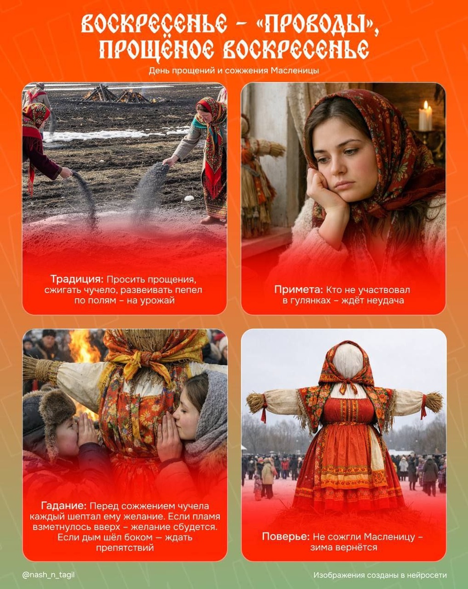 Он называется Прощеное воскресенье. Главная традиция — просить прощения у родных, друзей и знакомых, чтобы войти в весну без обид и тяжести на душе. По обычаям, сегодня ходят в гости, собираются за общим столом и проводят время с близкими. А вот от домашней работы старались отказаться: не убирали, не стирали и не занимались тяжелым трудом, посвящая день общению и примирению. 📍Подписаться | Предложить новость | Дать «буст»