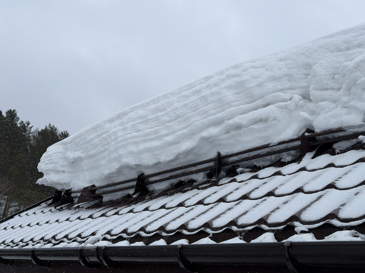 С крыши дома, именно с подветренной стороны, в оттепель сошёл снег и сорвал снегозадержание. Причём не просто «погну