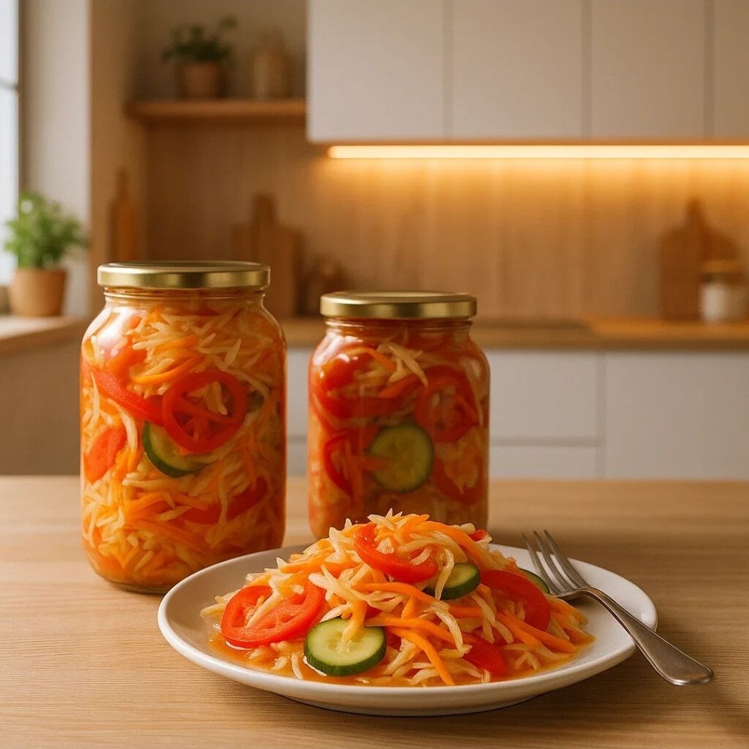 Яркий, ароматный и очень вкусный салат! Отлично подходит в качестве закуски и всегда выручает на праздничном столе. Лёгкий маринад придаёт овощам особую пикантность. 🛒 Ингредиенты: Капуста — 1 кг Морковь — 1 кг Лук — 1 кг Болгарский перец — 1 кг Помидоры — 1 кг Огурцы — 1 кг Соль — 5 ч. л. Сахар — 5 ст. л. Растительное масло — 1 стакан Уксус 9% — 1 стакан Чеснок — по желанию ✨ Заправка/маринад: Масло, уксус, сахар, соль 👨🍳 Приготовление: Все овощи нарежьте соломкой. Переложите их в большую ёмкость, добавьте масло, уксус, сахар и соль. Перемешайте. Оставьте овощи мариноваться на 1 час. Затем поставьте на огонь, доведите до кипения и варите не более 10 минут. Разложите салат по стерилизованным банкам вместе с маринадом и закатайте. И вот он — вкусный и полезный овощной салат, который будет радовать вас всю зиму! ❄🥰 🙏 Подпишитесь, чтобы не потерять! 👉 Тот Самый Салат в МАХ👈