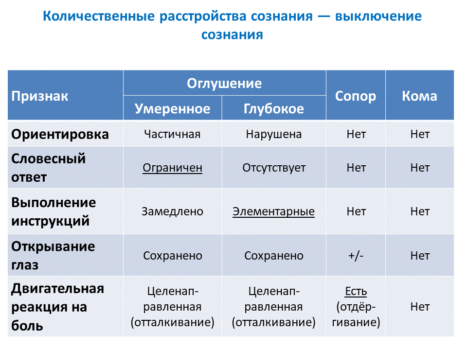 Итак, мы продолжаем рассматривать количественные изменения сознания, начатые в предыдущей статье. Сегодня мы рассмотрим уже более серьёзные изменения как сопор и кому, приятного прочтения Сопор (от лат. sopor — оцепенение) — это глубокое угнетение сознания, при котором утрачивается произвольная психическая деятельность, но сохраняются безусловные рефлексы. Сопор развивается при более тяжелых поражениях, затрагивающих верхние отделы ствола мозга или таламус . Причины: тяжелые ЧМТ, обширные инсульты, выраженные метаболические нарушения (гипогликемия, печеночная недостаточность), отравления нейротоксичными ядами . Главное отличие сопора — возможность вывести пациента из патологического сна, но лишь на короткое время и с помощью очень сильных стимулов, таких как: Сопор может длиться от нескольких часов до 1–2 недель. Это критическое состояние, требующее интенсивной терапии.